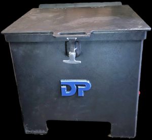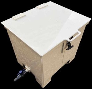 This soaker is made of durable plastic, the internal dimensions are 60cm X 50cm X 46cm. It has a lid with the lever to press the hay well into the water. The soaker is fitted with a filter at the bottom to catch hay, as well as a tap which can be connected to a pipe to direct the water away.